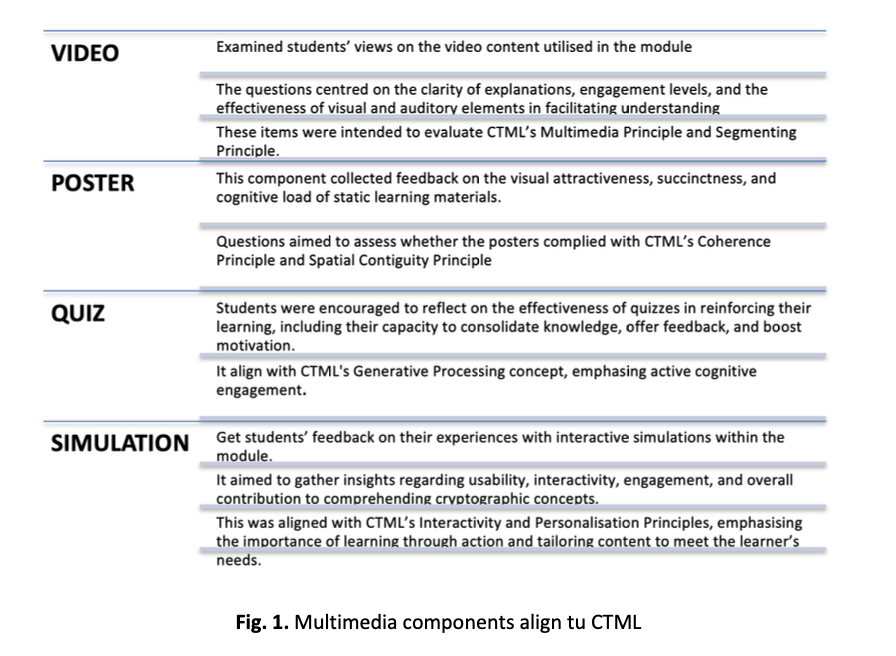 The incorporation of multimedia components such as videos, infographics, quizzes, and simulations has become crucial in improving learning engagement and understanding. However, how effective these methods are primarily hinges on their design in minimising cognitive overload and encouraging active learning. Therefore, this research examined students’ views on a multimedia focused learning module through the Gather platform for different academic levels, concentrating on its alignment with the Cognitive Theory of Multimedia Learning (CTML). A group of 30 students shared open-ended responses regarding four main learning checkpoints: video, poster, quiz, and simulation. The analysis revealed that videos were engaging and clear, aligning with CTML’s multimedia principles; posters were visually appealing but criticised for too much text, highlighting coherence issues; quizzes effectively reinforced knowledge through active recall; and simulations offered interactivity but faced technical challenges, relating to interactivity and personalisation principles. In general, the results suggest that multimedia learning can significantly enhance student engagement and understanding when crafted in accordance with CTML principles. This research highlights the necessity for a well-balanced design, adaptive assessments, and strong interactive tools to maximise learning results.