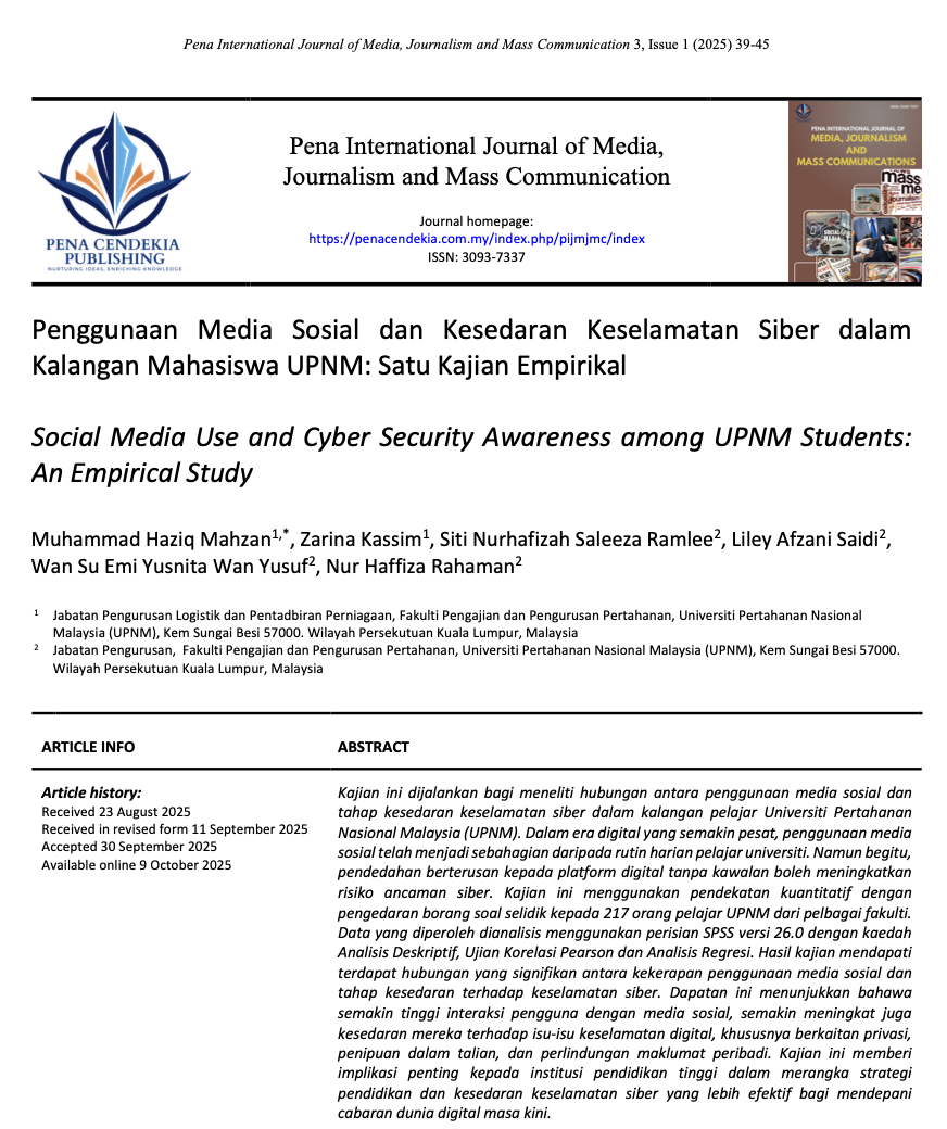 • Penggunaan Media Sosial dan Kesedaran Keselamatan Siber dalam Kalangan Mahasiswa UPNM: Satu Kajian Empirikal Social Media Use and Cyber Security Awareness among UPNM Students: An Empirical Study
